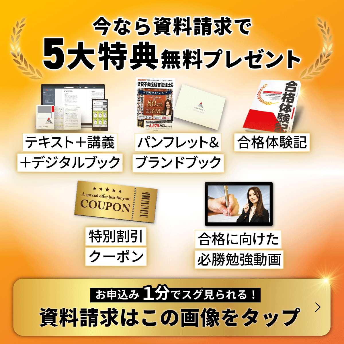 アガルートの講座なら、受講料全額返金などの合格特典を受け取れます。