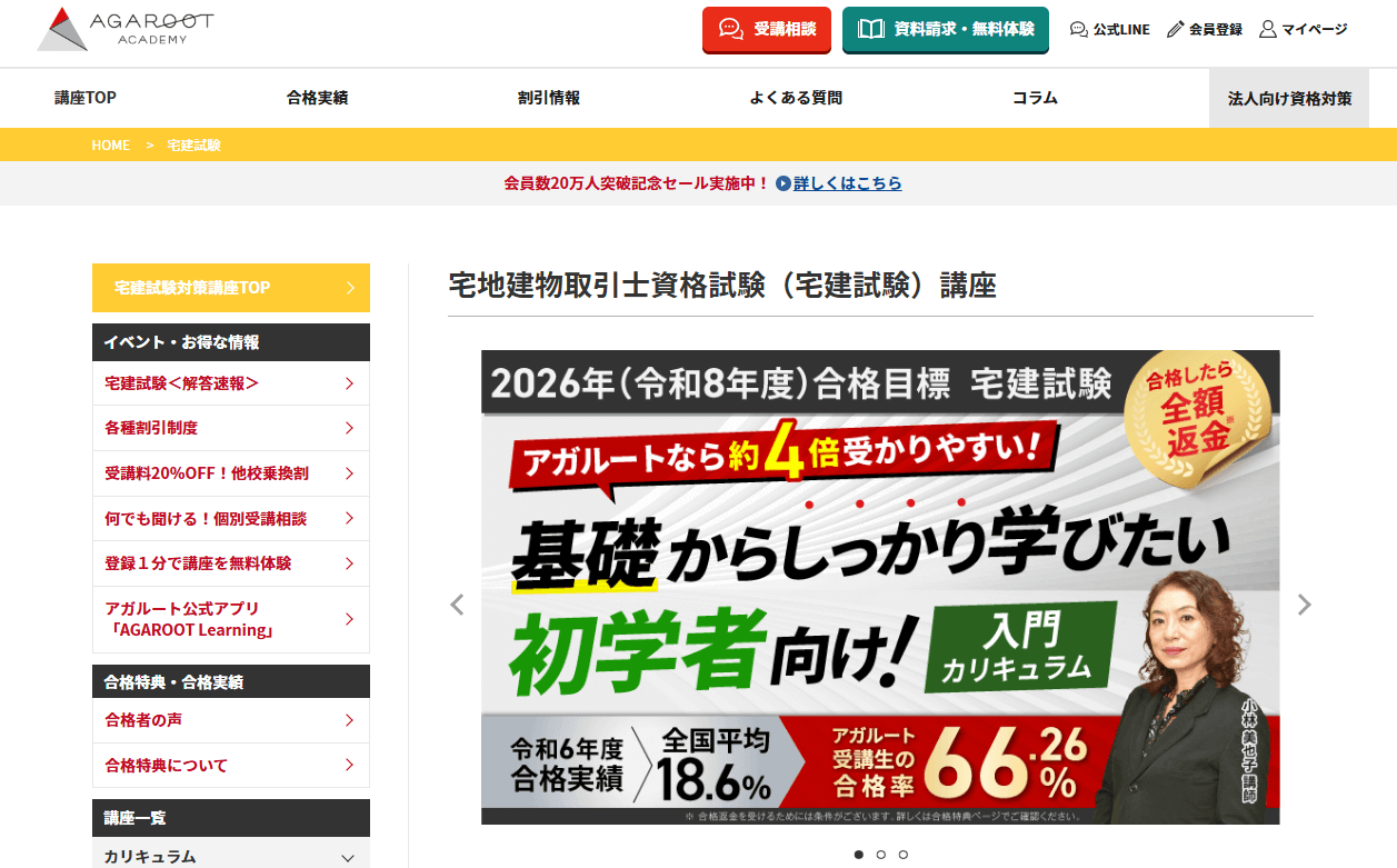 1位:アガルート | 【合格特典】 ・受講料全額返金またはお祝い金10,000円 【割引制度】 ・他校乗換割引 ・再受講割引 ・他資格試験合格者割引 ・ステップアップ割引 ・受験経験者割引 ・家族割引 |